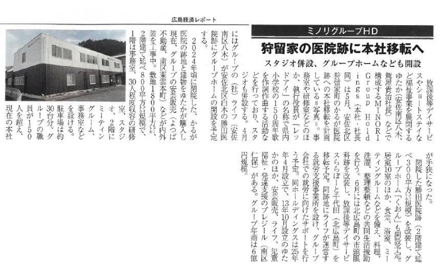 「ミノリグループHD 狩留家の医院跡に本社移転へ スタジオ併設、グループホームなども開設 」