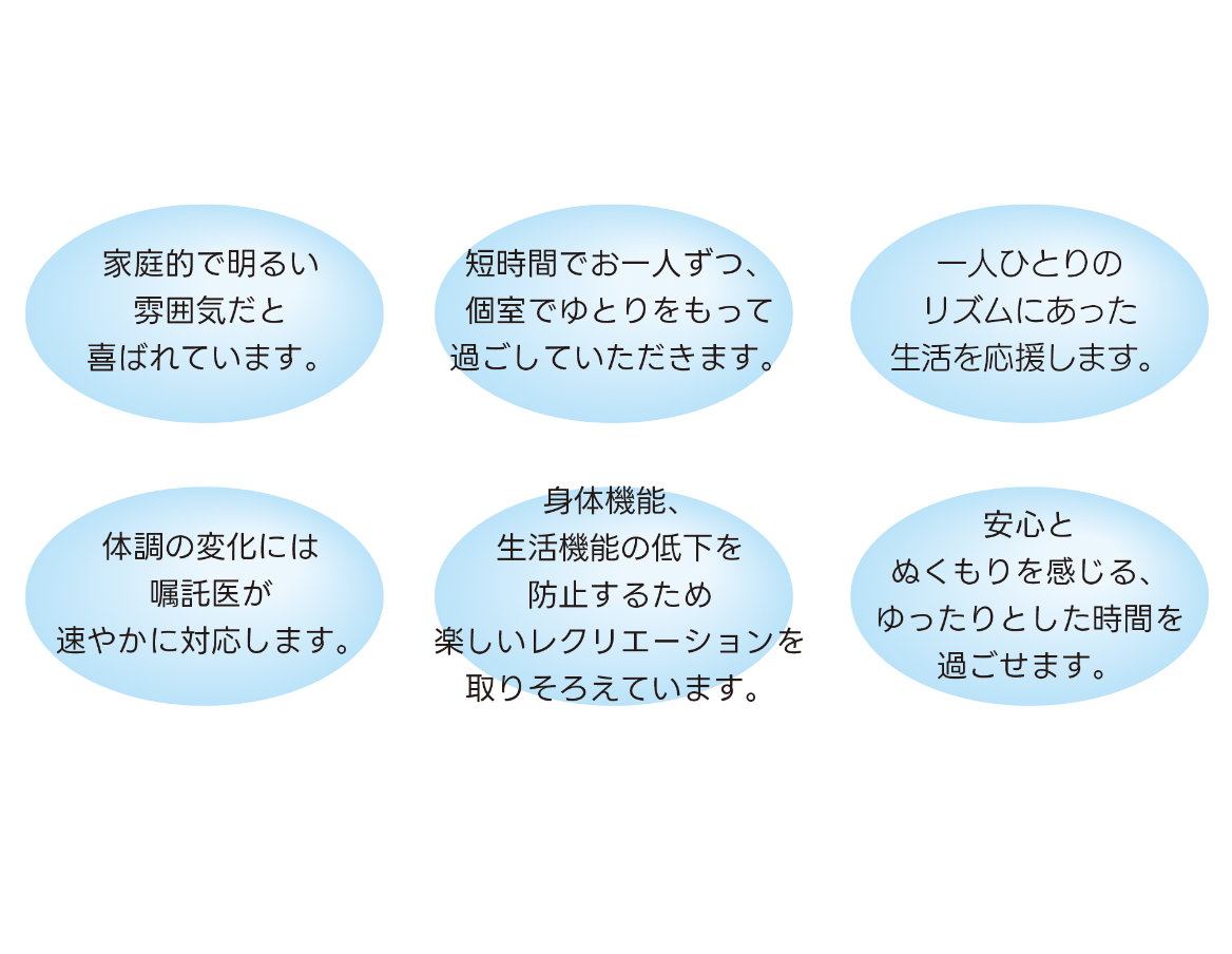 ご家庭と同じ環境で過ごしていただけるよう心掛けております。初めての方も安心してご利用ください。